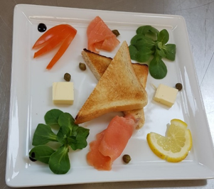Placer le saumon sur les assiettes, les tomates, les rondelles de citron, pousse d’oignons et les câpres